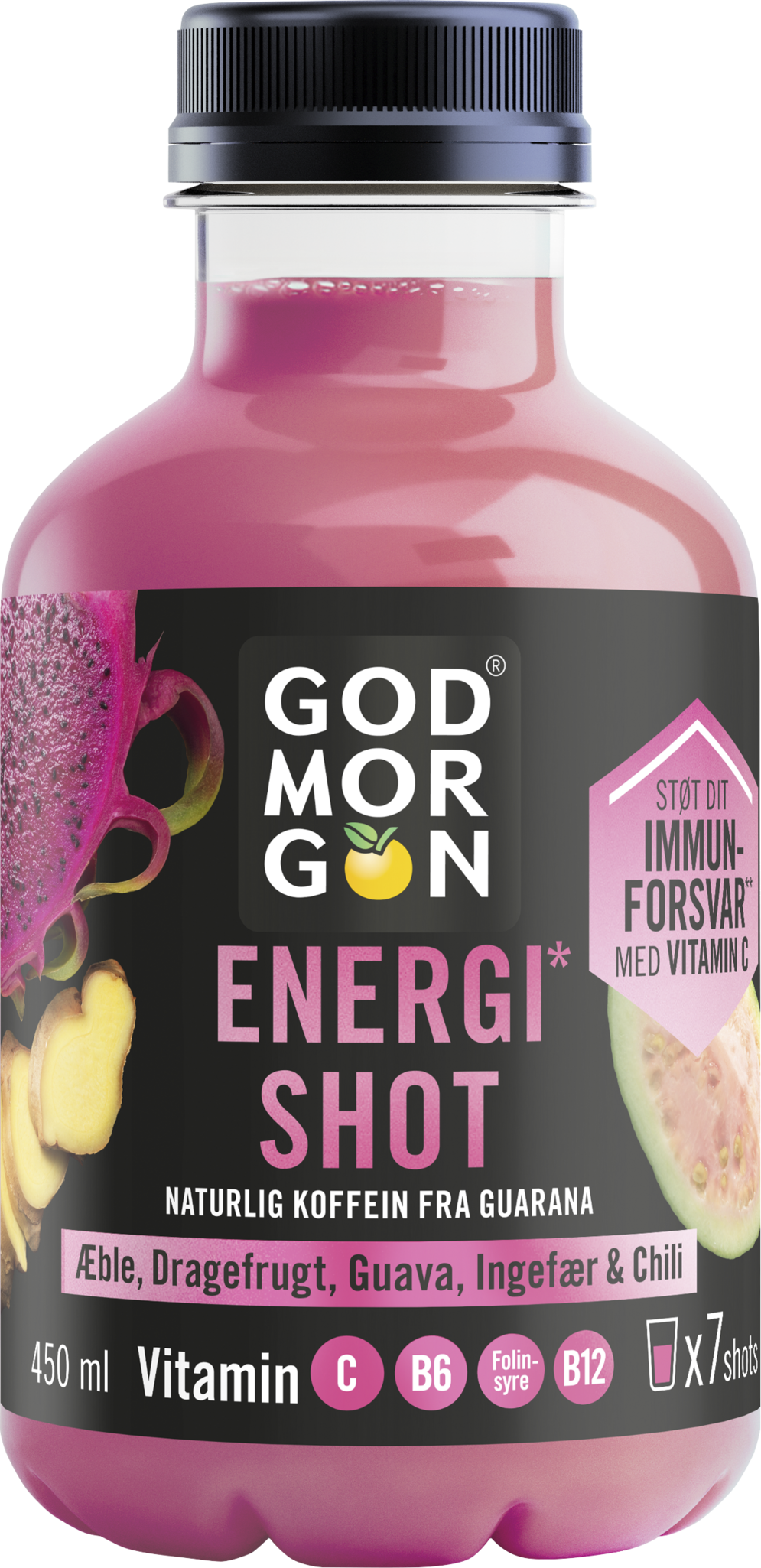 God Morgen® Energishot er et farverigt og forfriskende shot med en unik smagskombination af æble, guava, pink dragefrugt og et strejf af chili. Indeholder koffein for at give dig lidt ekstra energi i hverdagen. Shottet indeholder også Vitamin C, B6, B12 og folinsyre, som bidrager til at mindske træthed og udmattelse. Ligesom alt andet fra God Morgen® er hver eneste flaske tappet lokalt på Fyn og fyldt med kvalitet.